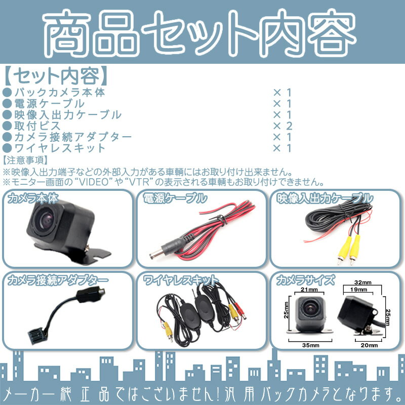 商品仕様 外観:角型 固定方法:ネジ固定 or 両面テープ固定(付属しません) センサー:CCD 画素数:628pix×582pix(36万画素) 視野角:水平 120° / 垂直 100 °/ 対角 170° 出力映像:鏡像 ガイドライン:有or無し 映像出力端子:RCA 定格電圧:DC12V 消費電流:70mA 本体サイズ(最大):横 35mm × 高 25mm × 奥行 32mm 電源ケーブルの長さ:約200cm 映像ケーブル長さ:約500cm 商品内容 ・バックカメラ本体 × 1 ・電源ケーブル × 1 ・映像ケーブル × 1 ・固定用ネジ × 2 ・ワイヤレスキット × 1 ・映像出力変換アダプター × 1 注意事項 ※必ずサイズ・形状・適合等をご確認の上、ご入札・ご購入ください。